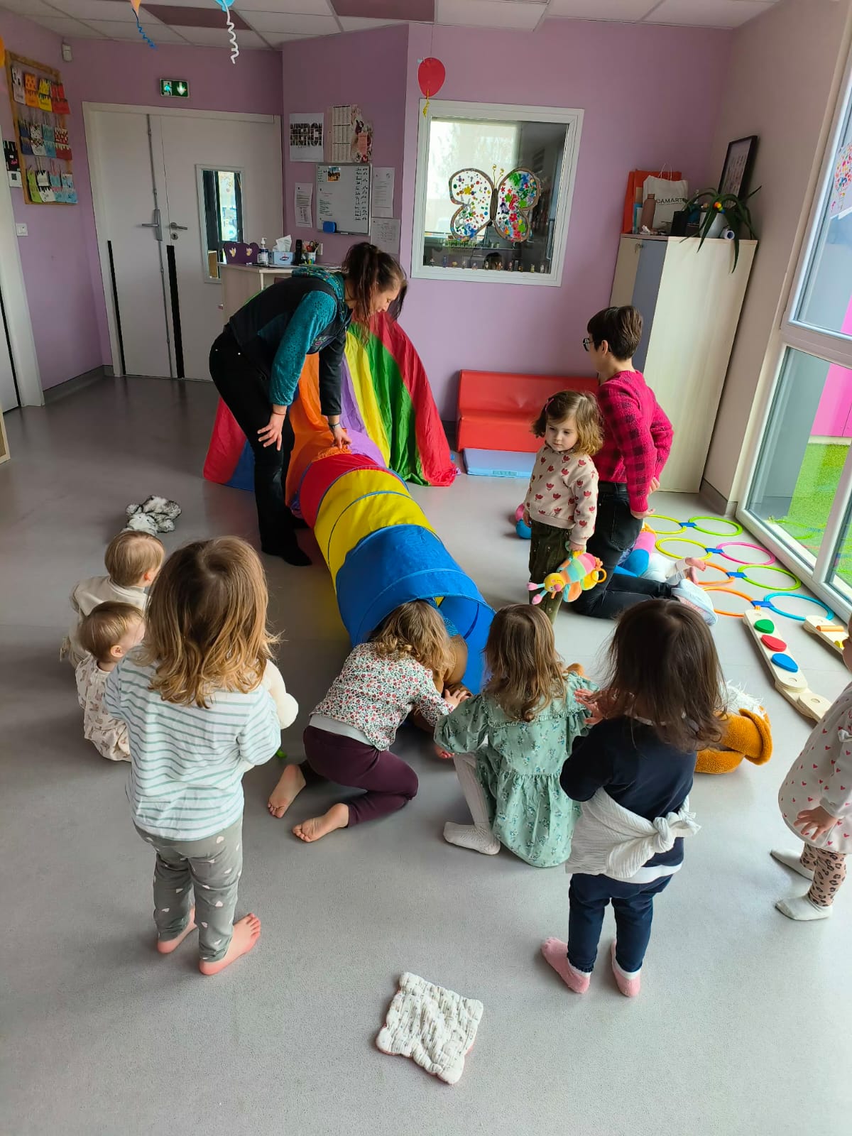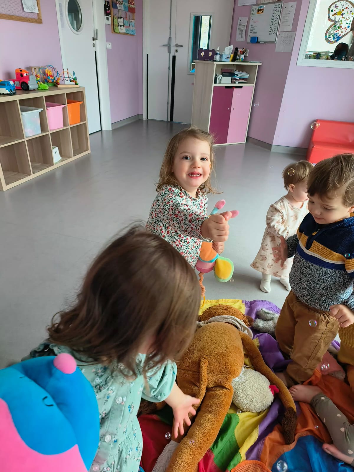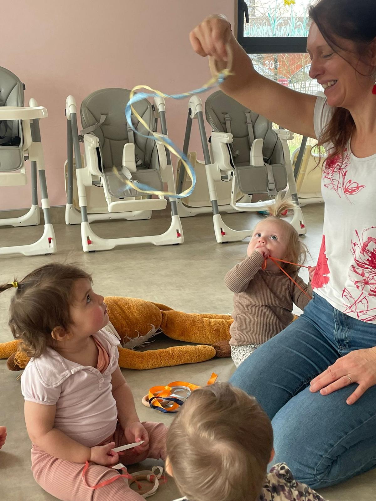 Dès que les bébés commencent à se déplacer, ils peuvent investir la salle de vie afin de faire leurs propres expériences en toute sécurité. Un environnement et du matériel adaptés, stimulant leurs sens ou leur motricité (mobiles musicaux, tapis d’éveil, …).